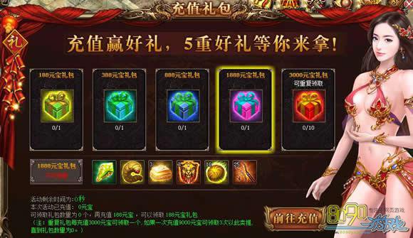 活动详情:活动期间充值达到指定元宝数,即可领取一份对应充值礼包,3000元宝礼包更可重复充值领取10次,每充值3000元宝可领取一个,直到礼包数为0为止。