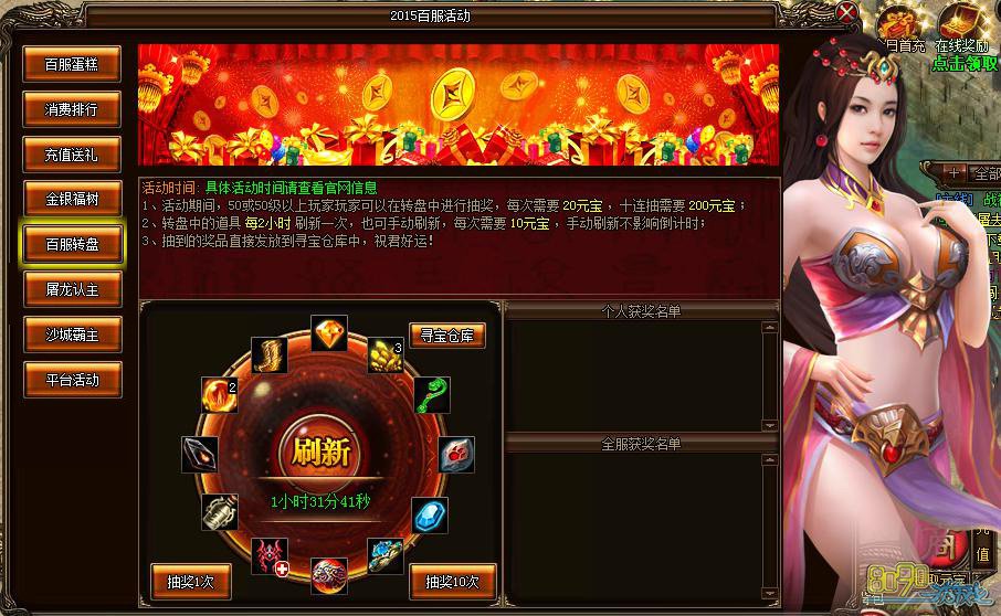 活动内容:1、活动期间,玩家可在活动面板中进行抽奖,每次抽奖需要20元宝;