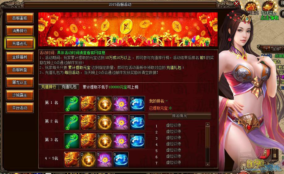 3、活动期间,玩家累计充值满足100000元宝且本服排名前5的玩家,还可获得充值排行奖励,奖励将在活动结束后以邮件形式发送;