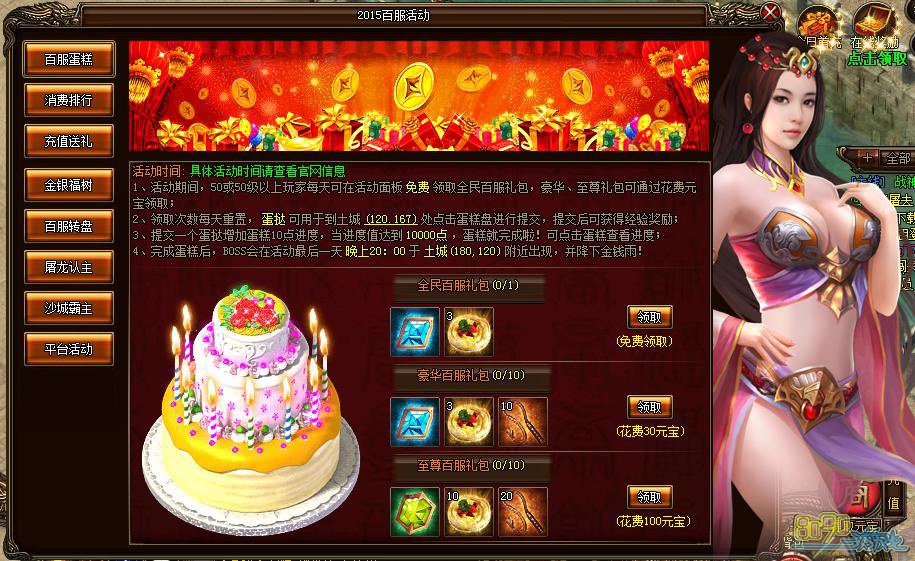 5、蛋糕完成后的当晚21:00,土城,王城还将降下金钱雨,50级以上的在线玩家均可获得一定数量的礼券,还有几率获得元宝哦!