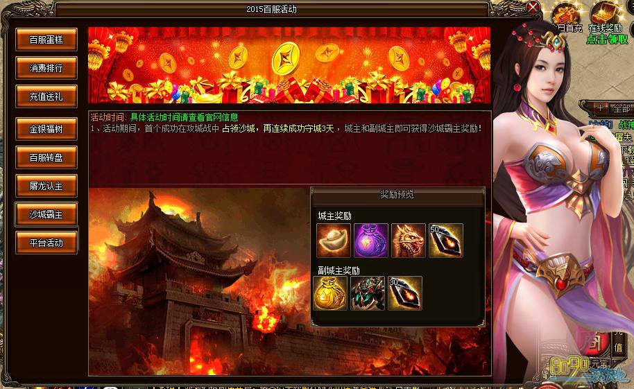 3、该服务器沙城城主可获得10000元宝,火龙华戒包*1,燃云龙御【30天】*1,焰光铁*50;