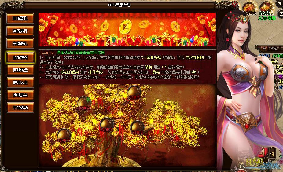 活动内容:1、活动期间,50级以上的玩家可在活动面板中培养和摘取金银福树的果实;