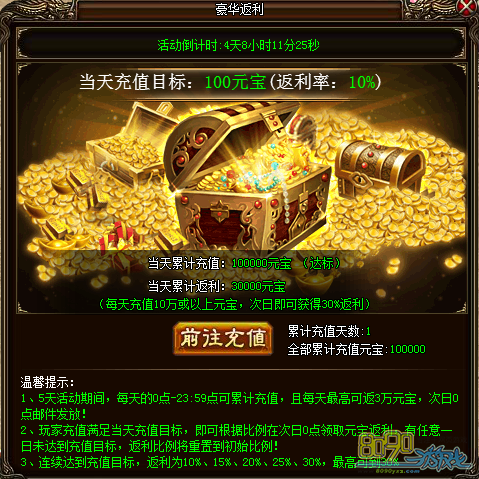 活动详情:活动期间,每天0:00-23:59可累计充值,且每天最高可返3万元宝,次日0点邮件发放。玩家充值满足当天充值目标,即可根据比例在次日0点领取元宝返利,有任意一日未达到充值目标,返利比例将重置到初始比例。连续达到充值目标,返利为10%、15%、20%、25%、30%,最高可到30%。