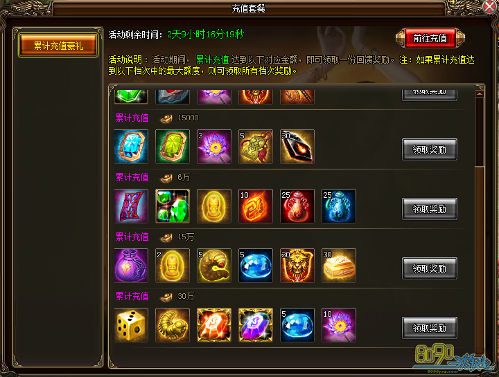 充值套餐上豪礼,累计充值琳琅满目珍宝巨献,不忍直视!诱惑逼人,心动不如行动,赶紧拿下吧!