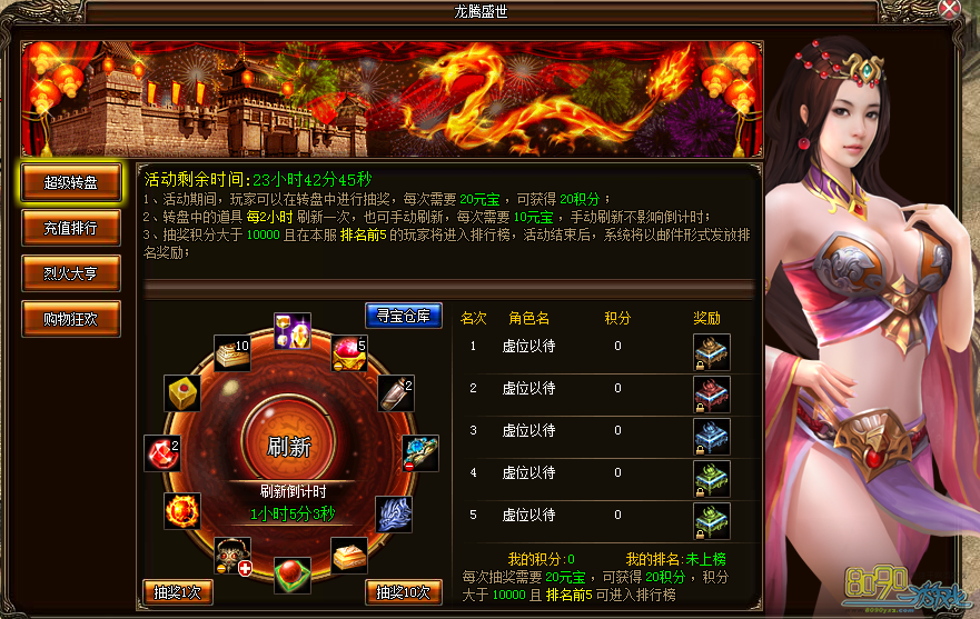 活动详情:活动期间,玩家可在转盘进行抽奖,每次需要20元宝,并可获得20积分;转盘每2小时刷新一次,可花10元宝手动快速刷新;转盘抽奖积分大于10000积分且在本服排名前5的玩家可进入排行榜,获得排名奖励。