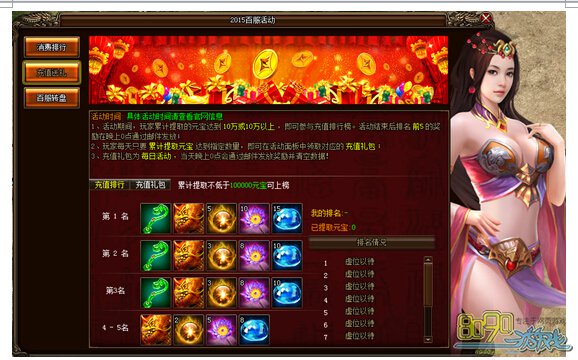 1. 在活动期间内,当天消费元宝排行前10的玩家且最低消费1000元宝都可以获得对应的奖励,奖励会在第二天发放,玩家上线就会在任务栏的右侧收到奖励提示。请给予背包足够的空间