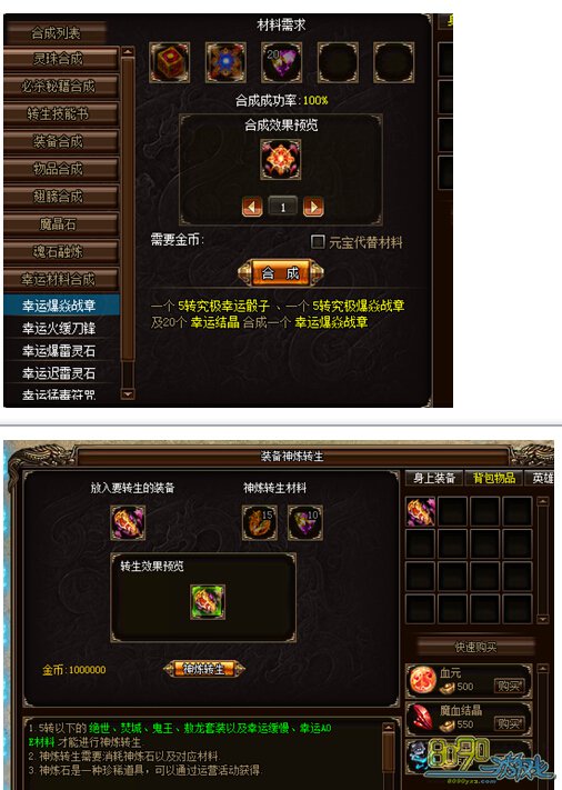 新增幸运材料合成,5转究极职业材料装备与5转究极幸运骰子加上20个幸运结晶合成一个对应的1转幸运职业材料,幸运职业材料装备可在土城NPC匠神那消耗神炼石及幸运结晶进行神炼转生。