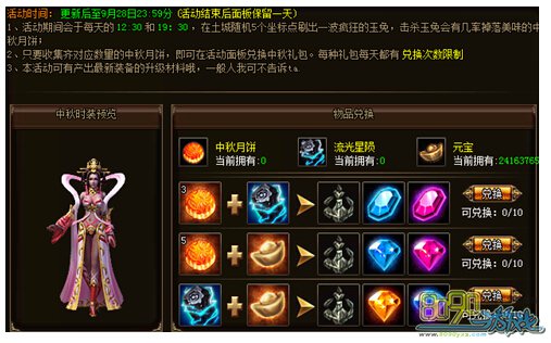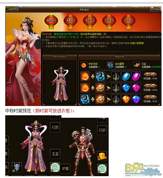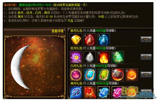 活动期间,按全服玩家累计充值数量点亮相应的月相,激活相应的花灯以及个人提取元宝满足要求时即可领取相应的中秋充值礼包,当点亮满月后,每天22:00系统将会在世界范围向50级以上在线玩家发放大量礼券,同时还有几率抽取部分玩家发放元宝奖励。