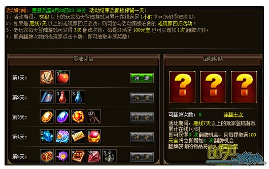 活动期间,50级以上玩家每天累计在线满足1小时即可领取登陆奖励。同时离线7天以上的老玩家回归游戏,则可参与右侧的老玩家回归翻牌活动,老玩家每天登陆游戏即可获得3次翻牌次数,且每累计提取100元宝即增加一次翻牌次数,翻牌次数累计不重置,翻牌获得的物品发放到寻宝仓库。