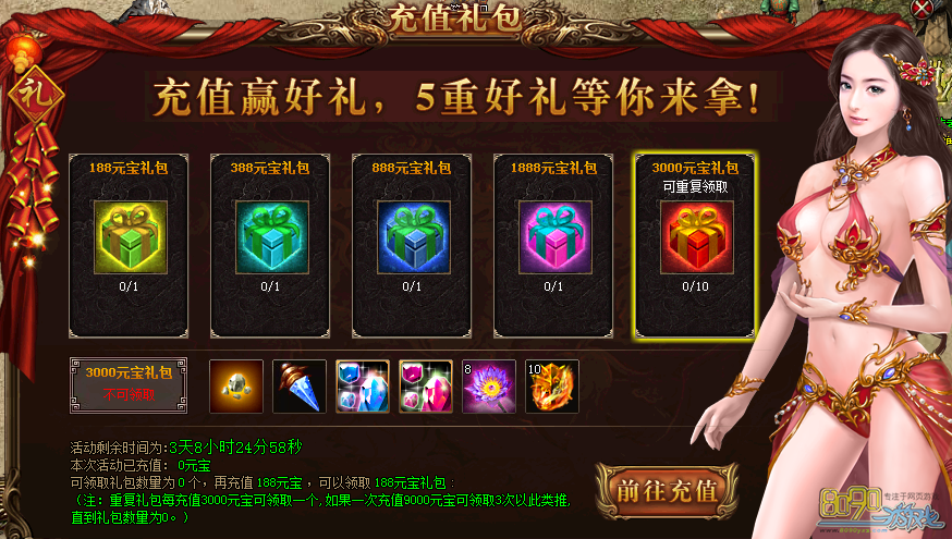活动详情:活动期间充值达到指定元宝数,即可领取一份对应充值礼包,3000元宝礼包更可重复充值领取10次,每充值3000元宝可领取一个,直到礼包数为0为止。