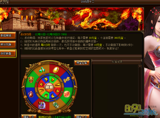 A.活动期间,玩家玩家可以在转盘中进行抽奖,每次需要30元宝,十连抽需要300元宝。