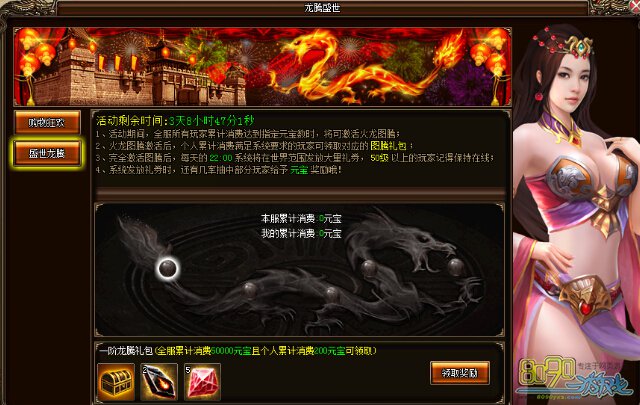 活动详情:活动期间全服所有玩家累计消费达到指定元宝数时,将可激活火龙图腾;火龙图腾激活后,个人消费满足相应要求即可领取对应图腾礼包;完全激活图腾后,每天22:00系统将在世界范围发放大量礼券,50级以上玩家记得保持在线,还有几率获得元宝奖励哦!