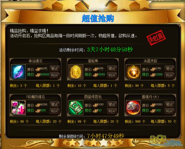 活动详情:活动开启后,抢购区商品每隔一段时间刷新一次,玩家可通过超低的价格抢购各种稀有道具,限量发售,物超所值,欲购从速!