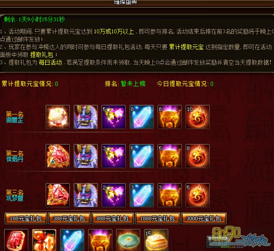 a) 活动期间,累计提取元宝10W以上且排行前3的玩家可获得排行奖励,奖励于活动结束时以邮件发送。