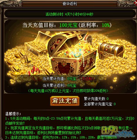 活动详情:活动期间,每天0:00-23:59可累计充值,且每天最高可返2万元宝,次日0点邮件发放。玩家充值满足当天充值目标,即可根据比例在次日0点领取元宝返利,有任意一日未达到充值目标,返利比例将重置到初始比例。连续达到充值目标,返利为10%、12%、15%、18%、20%,最高可到20%。