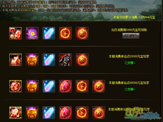 活动期间,消费满2888元宝即可领取每日消费奖励,奖励每日重置(不补发),需及时领取,本服消费每满5000元宝时会从在线玩家中抽取一位派发幸运奖励,奖励通过邮件发放,抽中玩家消费越多获得极品道具机率越高。同时,第一个使每天本服累计消费达1万、5万、10万的玩家可获得幸运奖励,奖励通过邮件发放,每天重置名额。本服累计消费每天重置。