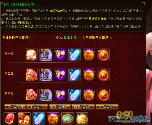 b) 活动期间,玩家每天累计提取元宝达到188、388、888、1888、3000即可在面板领取相应的每日充值礼包,礼包每日重置,当天没有领取的奖励第二天零点时以邮件补发。
