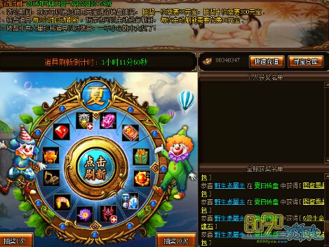 活动期间,玩家可以在面板进行转盘抽奖,抽奖一次需要30元宝,抽奖十次需要300元宝,转盘道具每2小时自动刷新,可以花费10元宝手动刷新,手动刷新不影响自动刷新时间。