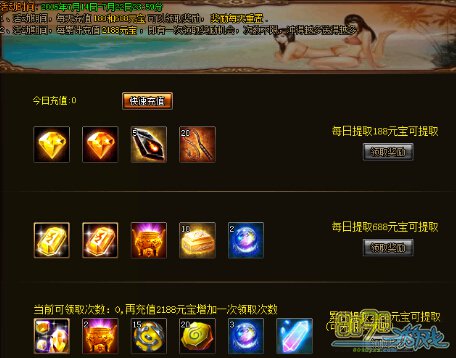 活动期间,每天提取188、688即可领取相应奖励,这俩项奖励每天零点重置,当天忘记领奖时零点会以邮件形式补发。活动期间,玩家每累计充值2188元宝即可增加一次2188礼包领取次数,次数没有上限,活动结束后忘记领取的奖励以邮件形式补发。