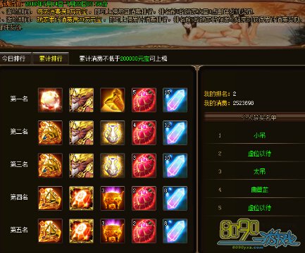 活动期间,玩家累计消费20万元宝及以上即可参与累计消费排行榜,活动结束时排行榜前5的玩家获得奖励,奖励以邮件形式发放。