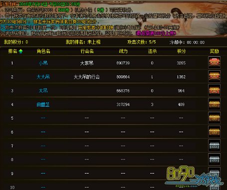 活动期间,击杀夏日活动BOSS可获得500积分,击杀每个小怪获得5积分。同时,玩家在有攻击次数情况下,在非活动场景击杀其他玩家可获得一定基础积分【战力差越高,积分越高】及对方10%的积分,被击杀的玩家降低10%积分【下限为0】,积分达到100及以上即可参与排行榜,攻击次数每2小时增加一次,上限为5次,没有攻击次数时击杀玩家不能获得积分,可以使用元宝或者冷却时钟道具消除冷却时间获得攻击次数【每小时10元宝】。活动结束后,积分排名前10的玩家获得奖励,奖励以邮件形式发放。