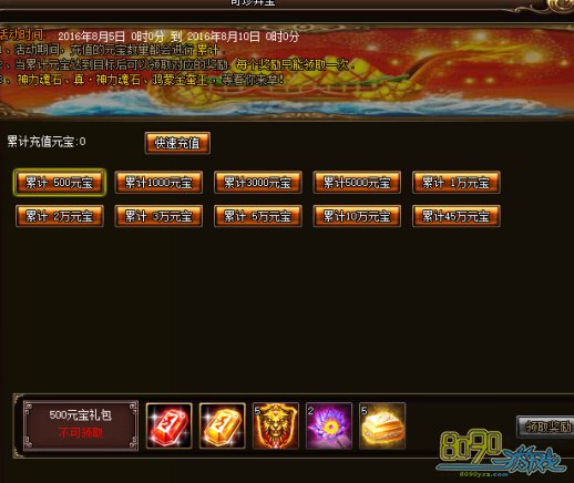 b) 活动期间,玩家每天累计提取元宝达到188、388、888、1288、1600即可在面板领取相应的每日充值礼包,礼包每日重置,当天没有领取的奖励第二天零点时以邮件补发。