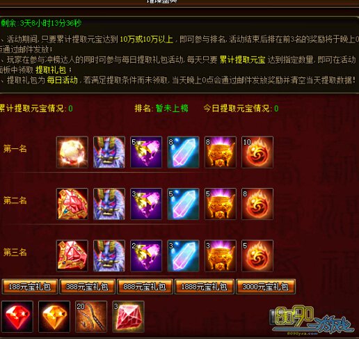 a) 活动期间,累计提取元宝10W以上且排行前3的玩家可获得排行奖励,奖励于活动结束时以邮件发送。
