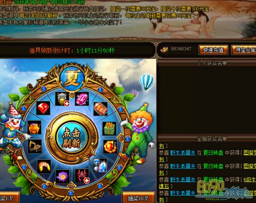活动期间,玩家可以在面板进行转盘抽奖,抽奖一次需要30元宝,抽奖十次需要300元宝,转盘道具每2小时自动刷新,可以花费10元宝手动刷新,手动刷新不影响自动刷新时间。