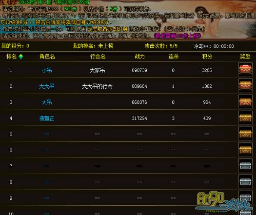 活动期间,击杀夏日活动BOSS可获得500积分,击杀每个小怪获得5积分。同时,玩家在有攻击次数情况下,在非活动场景击杀其他玩家可获得一定基础积分【战力差越高,积分越高】及对方10%的积分,被击杀的玩家降低10%积分【下限为0】,积分达到100及以上即可参与排行榜,攻击次数每2小时增加一次,上限为5次,没有攻击次数时击杀玩家不能获得积分,可以使用元宝或者冷却时钟道具消除冷却时间获得攻击次数【每小时10元宝】。活动结束后,积分排名前10的玩家获得奖励,奖励以邮件形式发放。