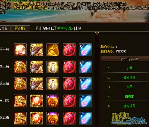活动期间,玩家累计消费20万元宝及以上即可参与累计消费排行榜,活动结束时排行榜前5的玩家获得奖励,奖励以邮件形式发放。