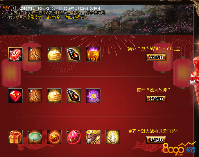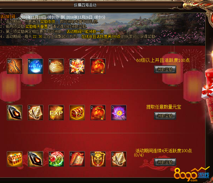 活动期间,只要满足奖励条件即可领取对应的奖励。活跃度及充值奖励每天可领取一次,每天零点重置,需玩家及时领取。累计登录奖励是累计10天连续活跃度100才能领取,与第一项活跃度奖励领取情况无关。同时,活动期间,每天22:30会在土城飘落红包雨,在线并且活跃度满100点的玩家可以获得奖励,同时会抽取一部分玩家发放道具奖励。