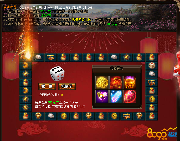 活动期间,玩家每消费350元宝可以获得一次摇骰子的次数,玩家点击摇骰子会获得一个顺时针前进的格数,同时玩家前进到相应格子 触发对应事件:获得奖励、前进、后退、优惠购物、重置事件【前进及后退后也会触发对应的格子事件,重置事件不会触发当前格子的事件】,每次玩家到达起点时会获得纵横四海礼包,开启礼包可获得固定奖励及惊喜奖励,每次玩家到达起点时系统自动重置所有事件,同时玩家也可花费100元宝手动重置。摇骰子次数不足时,玩家可花费150元宝摇骰子。摇骰子次数每天不重置。