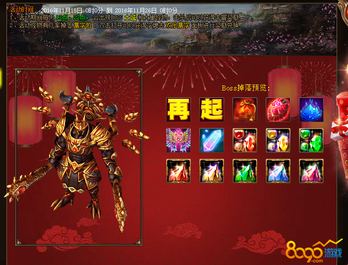 活动期间,每天13点及22点会在土城刷出BOSS藏字大王及小怪偷字小妖,击杀怪物可获得集字包及丰富奖励,藏字大王还会掉落稀有的字牌:再、起,字牌可在欢乐集字兑换丰富奖励。