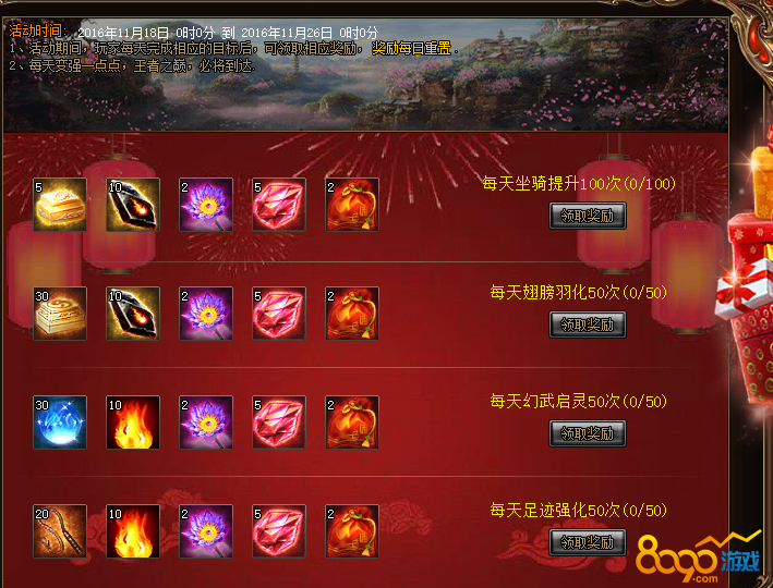 活动期间,玩家每天完成对应的目标后即可领取相应奖励,每项奖励每天只能领取一次,每天零点重置。