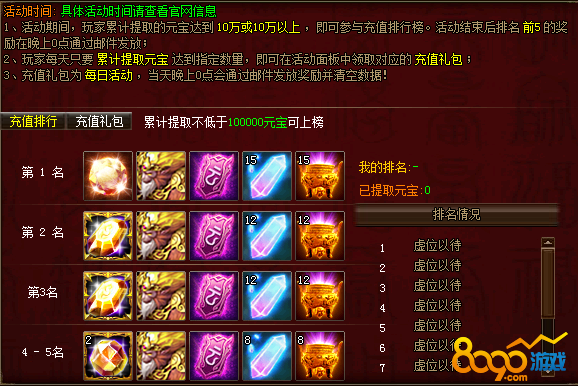 活动期间,玩家每天提取元宝达到188、688、1888、2888、3888时即可领取每日充值礼包。活动期间,玩家累计提取元宝达10万以上可参与充值排行,活动结束时排行前5的玩家可获得奖励,奖励在活动结束时以邮件形式发放。
