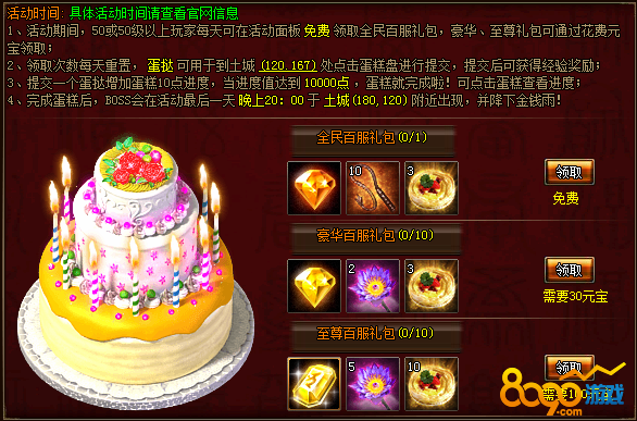 活动期间玩家可免费领取全民百服礼包,礼包内含蛋挞,可在土城蛋糕盘提交获得经验奖励并增加蛋糕进度,蛋糕进度到达10000后完成。蛋糕完成后,活动最后一天晚上20:00会在土城刷出BOSS钢背刃魔,BOSS存活时间60分钟,BOSS刷出同时会降下金钱雨。