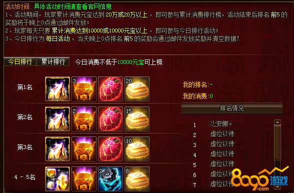 活动期间,玩家每天消费元宝达到10000或10000以上即可参与今日消费排行榜,每天零点时今日消费排行前5的玩家可获得奖励。同时活动结束前,累计消费元宝达20万及20万以上即可参与累计消费排行,活动结束时,累计消费排行前5的玩家可以获得奖励。