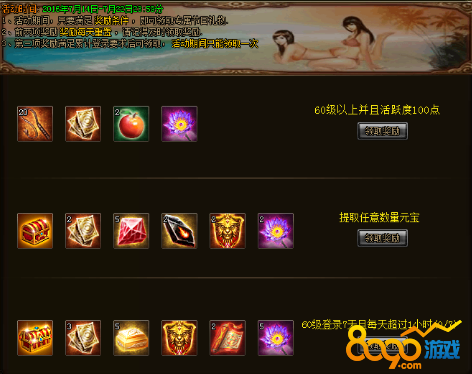 活动期间,玩家只要达到面板所示条件即可领取相应奖励,前两项奖励每天重置,需及时领取。第三项累积登录奖励满足天数后即可领取,活动期间只能领取一次。