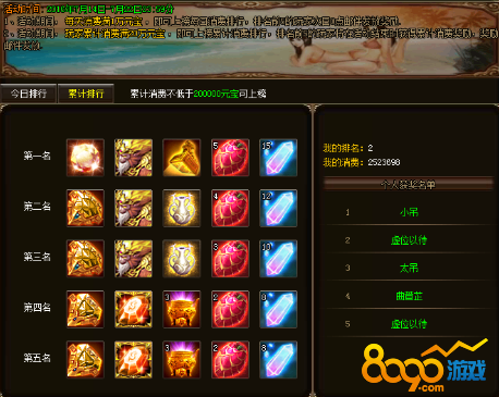 活动期间,玩家累计消费20万元宝及以上即可参与累计消费排行榜,活动结束时排行榜前5的玩家获得奖励,奖励以邮件形式发放。