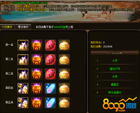 活动期间,玩家每天消费1万元宝以上即可参加每日消费排行榜,每天零点结算,排名前5的玩家获得奖励【同样额度时以时间先后排序】,奖励以邮件形式发送。
