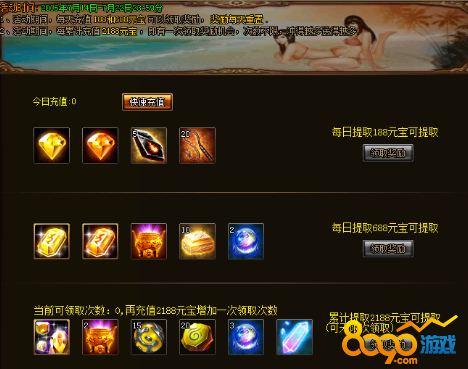 活动期间,每天提取188、688即可领取相应奖励,这俩项奖励每天零点重置,当天忘记领奖时零点会以邮件形式补发。活动期间,玩家每累计充值2188元宝即可增加一次2188礼包领取次数,次数没有上限,活动结束后忘记领取的奖励以邮件形式补发。