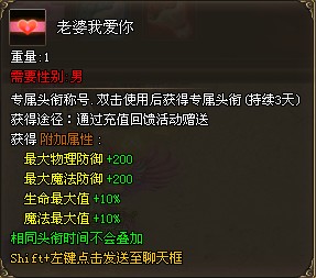 婚姻是一生一世的大事,《烈火战神》帮你大声喊出爱的宣言!只要在游戏中提取1314元宝,即可获得“老公老婆我爱你”真爱礼盒!包含“老公我爱你”以及“老婆我爱你”两个特殊称号,还有华丽的红蓝花束。戴上属于爱的称号,向世界宣告你们坚定不移的爱情吧!