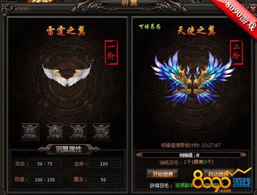 玩家在8090烈焰传奇中只要等级达到60级就可以开启羽翼系统!羽翼总共分为15阶,每阶都有自己独特的外形和强大的属性加成,羽翼阶级越高,外形更为霸气,属性加成也更为强大。羽翼提升需要消耗羽毛,羽毛可以通过各种活动、礼包、商城购买等方式获得。