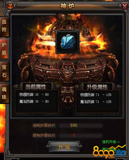 玩家进入8090烈焰传奇后,点击主界面的神炉系统即可进入护盾界面,护盾可以极大增加玩家的防御力,总共分为7级,等级越高的护盾能够提供给玩家更高的物理和魔法防御加成。护盾不可以进行强化,但是低等级的护盾可以通过消耗护盾碎片进行升级,进阶为更高等级的护盾。