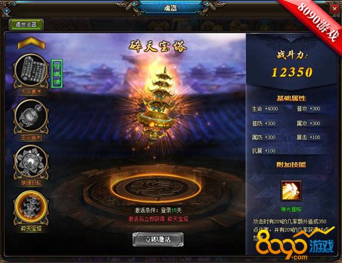 在8090烈斩中,碎天宝塔可以帮助玩家朋友增加12350点战斗力,可以帮助我们增加生命值4000点、普通攻击300点、属性攻击300点、普通防御300点、属性防御300点,暴击100点、抗暴100点,是目前属性增加最强的遗世至宝。