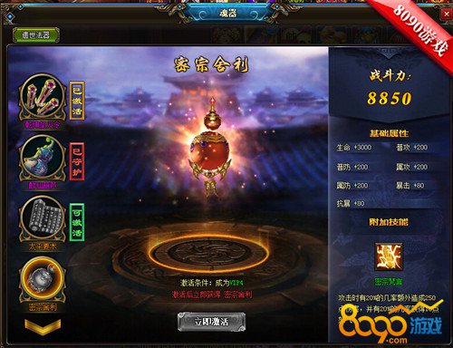 在8090烈斩中,我们成为VIP4级才能获取密宗舍利,所以并不是人人能够拿的到,所以这个魂器在游戏中战斗力增加是十分强悍的,可以增加战斗力8850点,生命值3000点、普通攻击200点、属性攻击200点、普通防御200点、属性防御200点,暴击80点、抗暴80点。