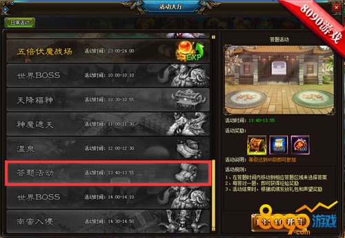 在8090烈斩中,每天中午12:00-12:15,等级达到30级以上的玩家可以在活动面板参加答题活动,答题活动一共有30条题目,题目之间有等待出题的时间和答题的时间,整个答题的地图分为两个区域,走到对应的答题区域即选择对应的答案。