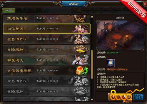 在8090烈斩中,女神护送是玩家40及开放的活动,我们的任务就是护送女神到指定的地点。每天的15:00-15:30,与NPC对话即可接取女神,护送期间女神自动走到目的地,中途不可进行其他操作,完成运送获得奖励,每日可以护送五次。