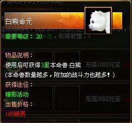充值10888元宝:3星本命兽-白熊、99朵鲜花*1