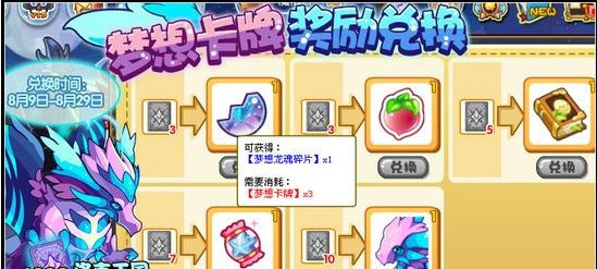 第二,玩家还可以来到魔法台找到梦想精灵对话,选择开启梦想卡牌参加游戏,通过游戏获得卡牌,就可以去兑换梦想龙魂碎片了。